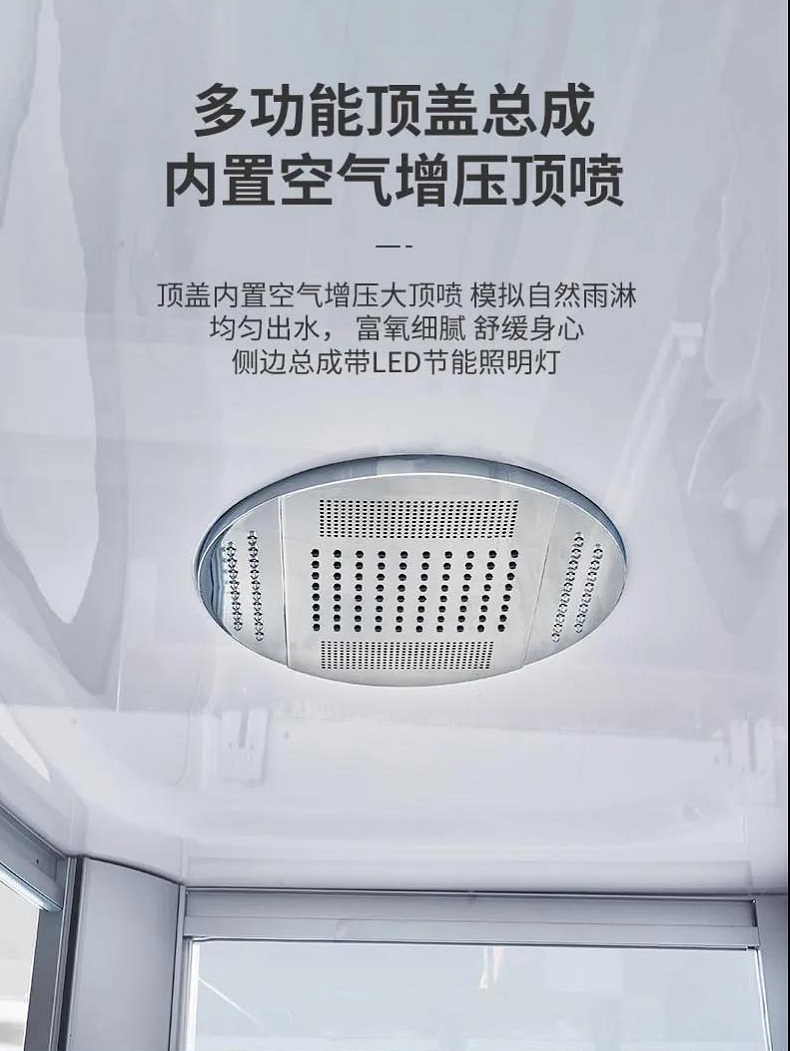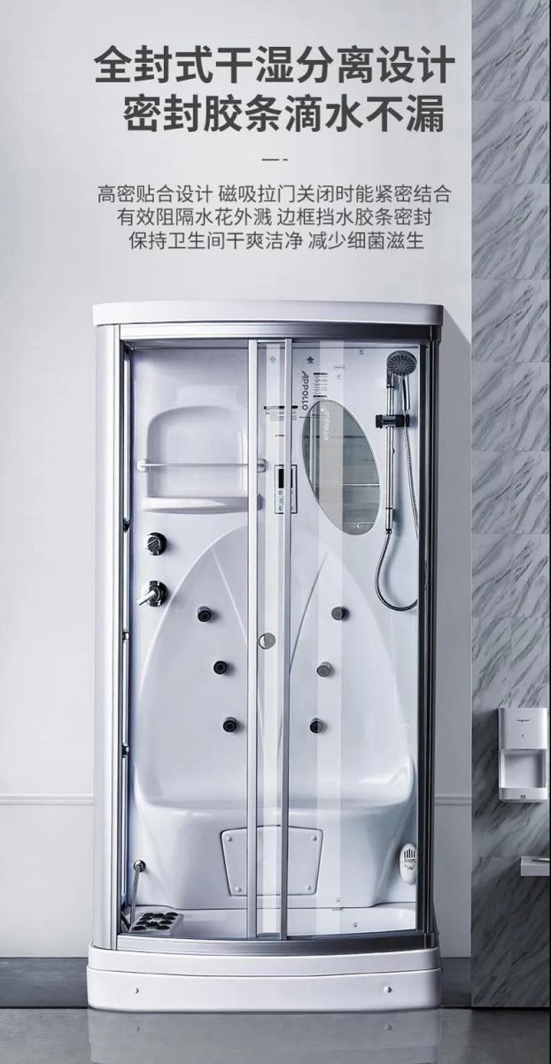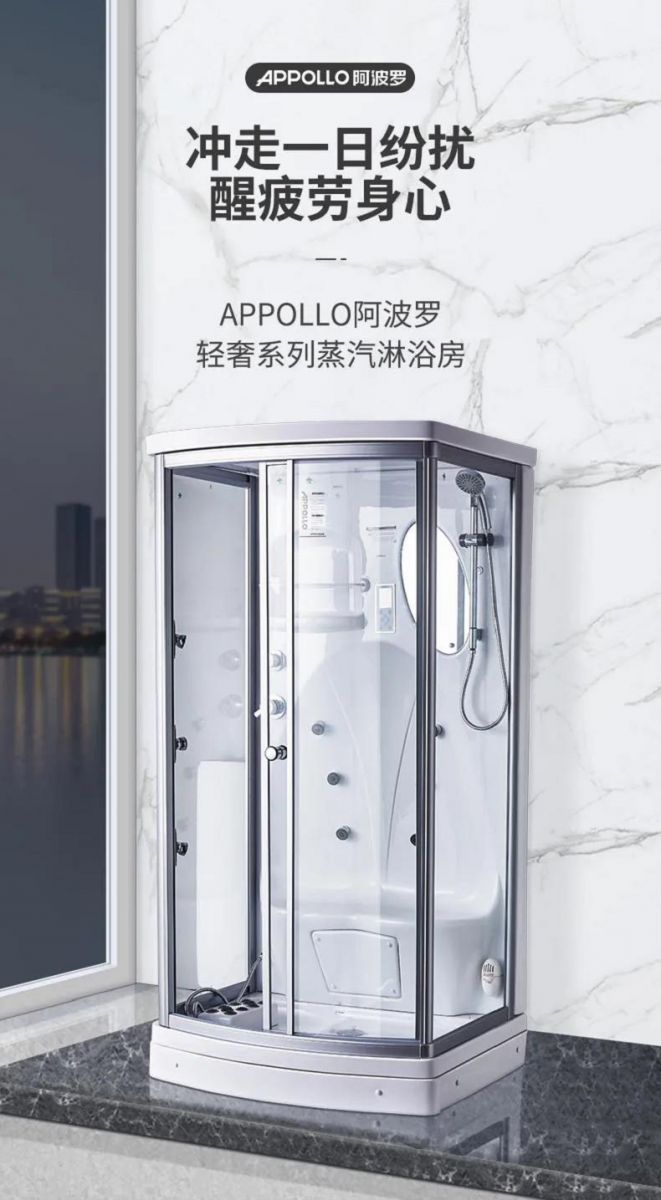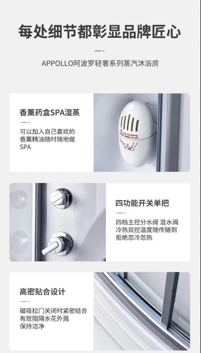 APPOLLO快盈蒸汽房不仅只有蒸汽功能,它还有淋浴、按摩等功能。顶落水淋浴花洒,超大顶喷,自动背部真空喷淋按摩,在蒸汽房中我们的皮肤受到高温刺激从而毛孔张开,在高温发汗排毒的同时将干净的水蒸气补充到深层肌肤达到持久的水嫩。蒸汽房还配有蒸汽香薰药盒,将香薰精油或中药包放入进而获得事半功倍的效果。
