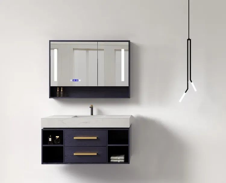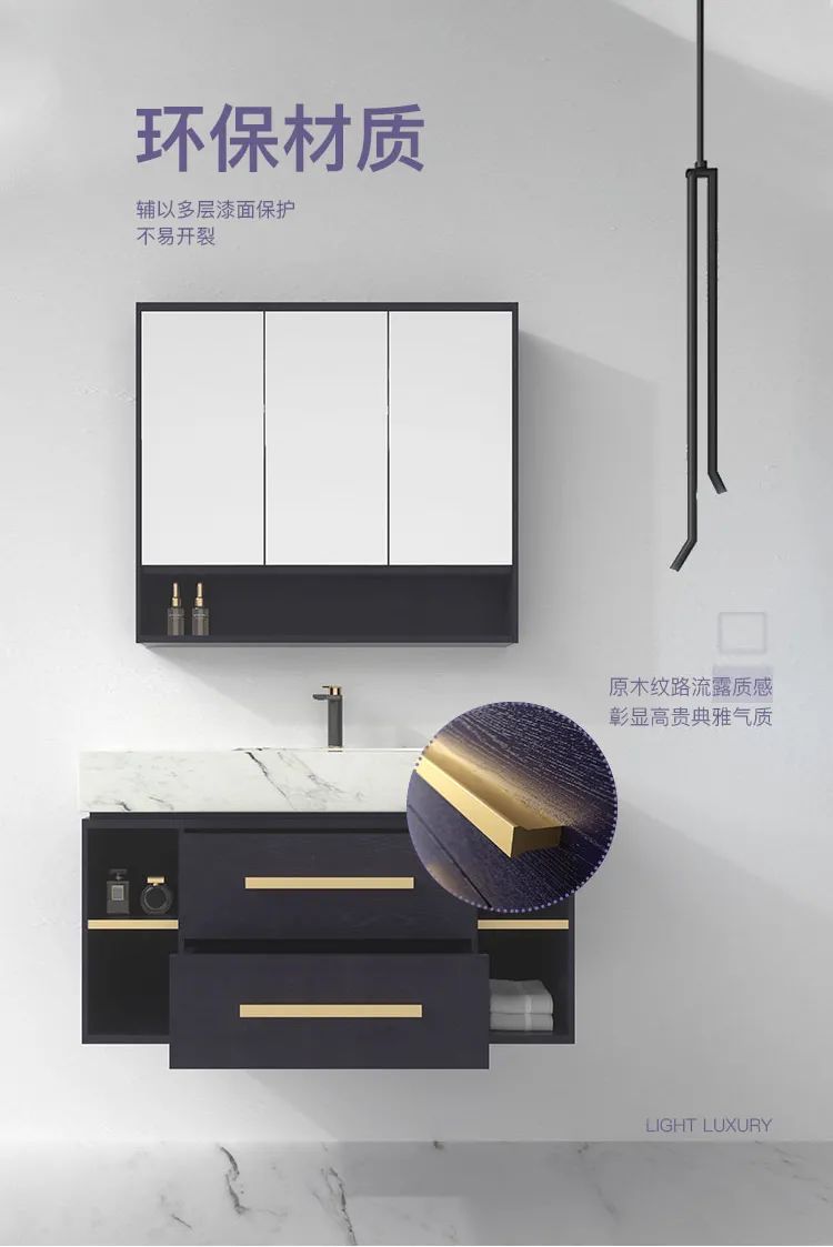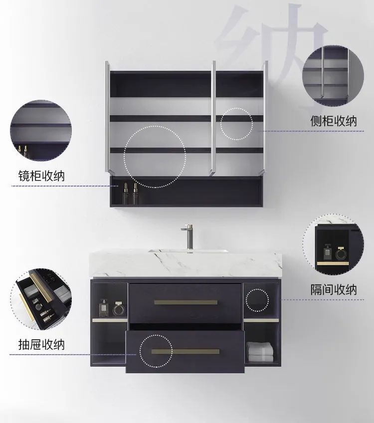 镜柜+侧柜+抽屉+隔间,镜柜分为开放式和封闭式,开放式镜柜空间大,可轻松收纳漱口杯、牙膏、牙刷、洁面用品等,在日常洗漱时方便拿取,幸福感拉满。封闭式镜柜使用原木隔板分区,让整个镜柜充满设计感的同时又能储存多样用品。